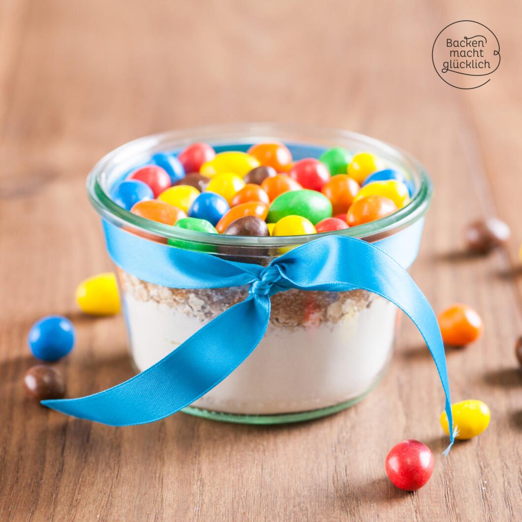 Die Backmischung in das Glas geben und alle Zutaten nacheinander schichten. Verschließe das Glas gut und dekoriere es mit einer hübschen Verpackung.
