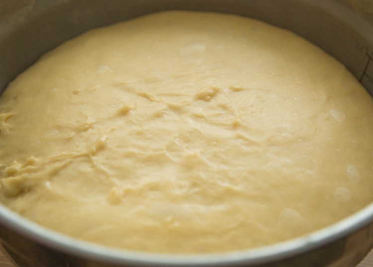 - Den Teig in der Schüssel abdecken und an einem warmen Ort etwa 1 Stunde gehen lassen, bis sich das Volumen verdoppelt hat.